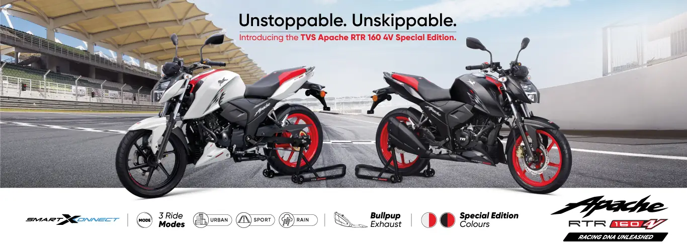 The TVS Apache RTR 160 4V has consistently pushed the limits of performance and technology, always outdoing itself in the race against time. With the first-in-segment Ride Modes and SmartXonnect, the 2021 TVS Apache RTR 160 4V pushes the envelope like never before. Race in any condition with nothing holding you back. It’s time to become the Unstoppable.